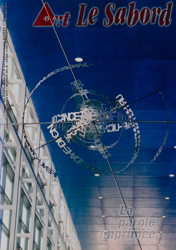 Dans ce quarante-cinquième numéro, la revue Art Le Sabord poursuit sa démarche de mettre ensemble, sur un même support, deux formes de langage, celui de la littérature et celui des arts visuels. Nous croyons en la capacité de communication des mots et des images et en particulier au pouvoir générateur de leur rencontre. Aussi, vous trouverez rarement dans Le Sabord des textes critiques sur l'oeuvre : des revues comme Parcours, ETC Montréal, Magazin'Art et Vie des Arts s'acquittent admirablement de cette tâche. Dans Le Sabord, le lecteur est le seul critique, le mot et l'image se dévoilent sans intermédiaire